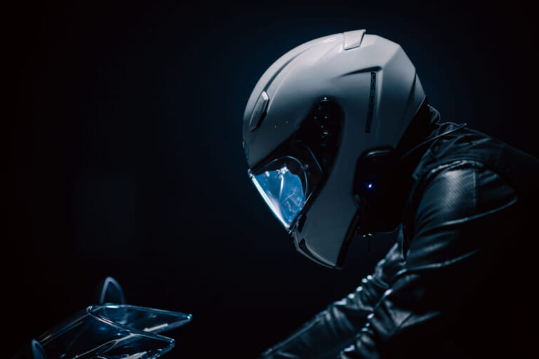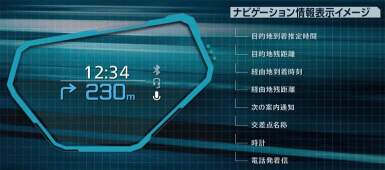 某大人気漫画の“スカウター”をイメージさせるHUDは、ライディングへの影響を最小限とするサイズで情報を投影するほか、周囲の明るさに合わせて5段階に輝度を自動調光。また、クリア/スモークなどシールドの種類に応じだ輝度を設定することも可能となっている。