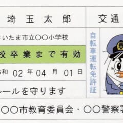 子供自転車運転免許証の見本。交通安全講習/学科試験のほか、模擬コースでの交差点の渡り方や一時停止といった実技試験があり、合格するともらえる。※埼玉県警察ホームページ内「子供自転車運転免許制度の推進について」より引用(埼玉県警察本部交通総務課/'22年4月12日更新)