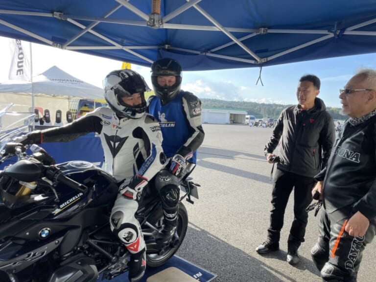 袖ヶ浦FRWでは、「BMW Motorrad Circuit Experience in 袖ヶ浦」に参加。ミシュランプログラムとしてタンデム走行とレッスンをさせてもらいました。タンデム走行は、面白いらしいですよ(笑)。後ろに乗った方に感想を聞くと、皆さん口を揃えて「ブレーキングは1発目から『バーン!』とハードなんですね!」「フロントブレーキはコーナーのあんなに奥まで握り続けてるんですね!」と、ブレーキについて驚いていたのが印象的でした。