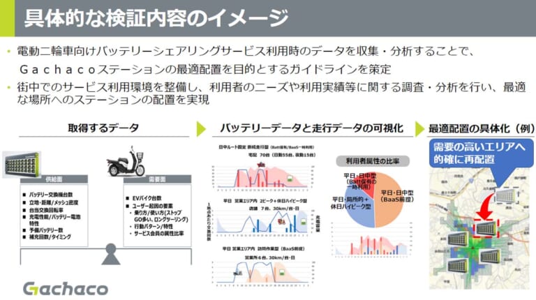 この実証事業では、電動二輪車向けバッテリーシェアリングサービス利用時のデータを収集・分析することで、ステーションの最適配置を目的とするガイドラインを策定していく。