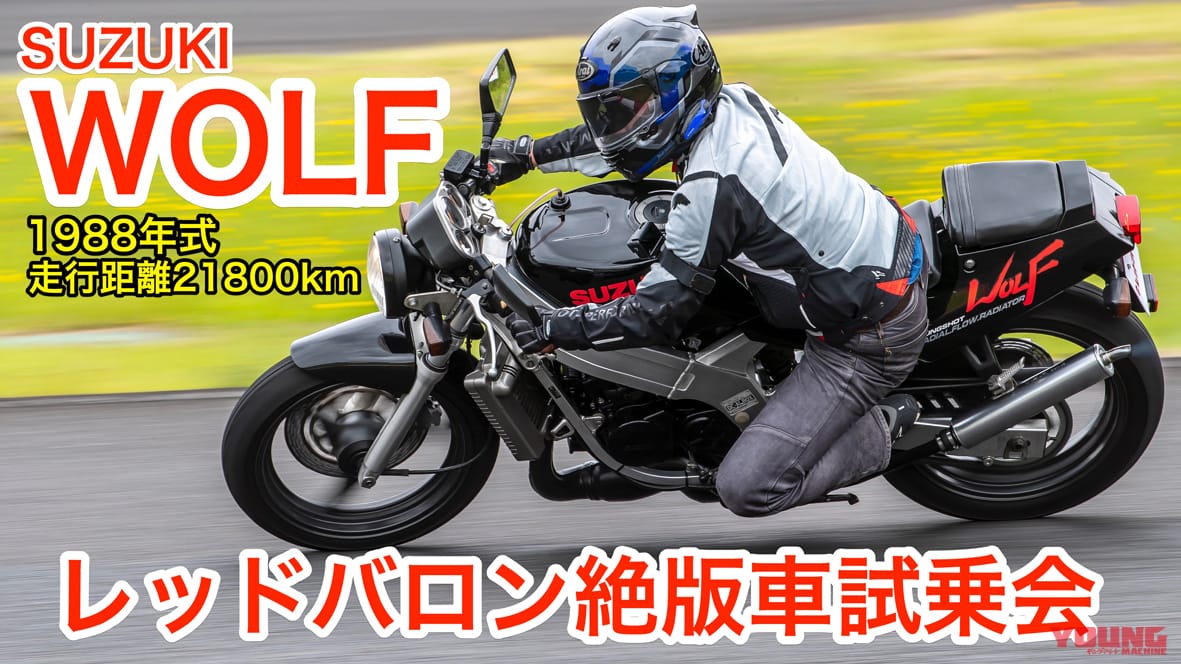 レッドバロンが主催する二輪媒体関係者向けの「絶版車試乗会」が那須モータースポーツランドで開催された。この試乗会はレッドバロンが販売する中古車に試乗できるというもので、20台近い試乗車が用意された。その中から今回紹介するのは1988年登場のスズキ・ウルフ(250)。レーサーレプリカ時代が収束していくなか、メーカー各社は新しいバイクのあり方を模索。1989年にゼファーが登場してネイキッドブームが巻き起こるが、ブーム前夜に生まれたウルフはレーサーレプリカ・RGV250ガンマがベースの2サイクルネイキッド。試乗車両は1988年式で走行距離は21800km。テスターはフリーライターの谷田貝洋暁だ。