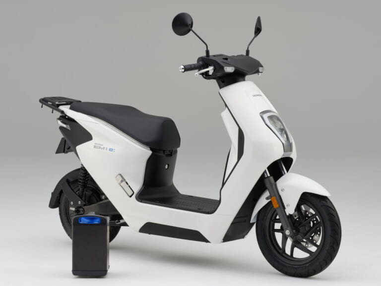 【HONDA EM1e:】ホンダがEICMAで発表した、初めての一般市販用バッテリーEVスクーター。原付一種相当の定格出力で、国内4メーカーが共通仕様で採用することを決めたモバイルバッテリーパックe:を使用する。現在、ホンダが法人向けに販売する原付一種相当のEVはBENLYe:が36万3000円で、このEM1e:の値付けがとても気になるところだ。