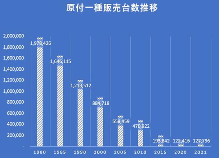 周知のとおり、原付一種の販売台数は’80年代をピークに激しく右肩下がりで、絶頂期の300万台オーバーから’21年は12万台まで減少している。しかし、保有台数は約500万台。多くの人の便利な「足」として健在だ。