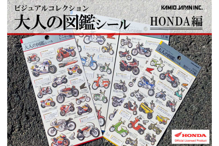 カミオジャパンの「大人の図鑑シール」は、大人の好奇心や知識欲、コレクター魂を揺さぶるテーマで好評のシリーズ。マニアックなものからカワイイものまで幅広いラインナップが特徴だが、今回、初の企業コラボとして「HONDAバイク編」が登場! 4つのテーマでマニアックなホンダ車がシール化されているぞ。