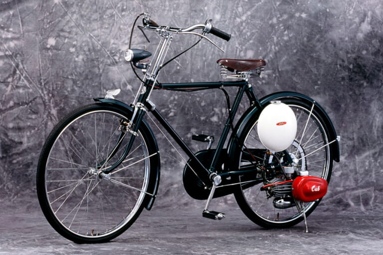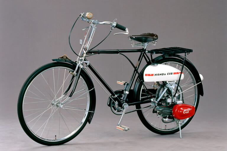 本記事で取り上げるホンダカブe:は、ある意味ではホンダが初めて発売したカブ号F型(自転車用補助エンジン)の現代版と言えなくもなさそう……といっても、共通点はペダルが付いていることくらいだろうか。