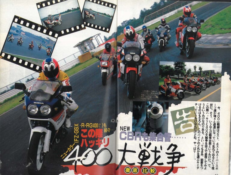 ヤングマシン1985年10月号より。その名も「400大戦争」と銘打って400ccスーパースポーツ軍団を比較テスト。筑波サーキットのラップライムと、ヤタベのゼロヨン加速&最高速が計測された。