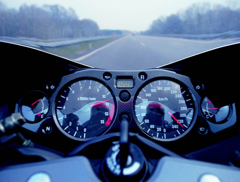 スペインで行われた初代ハヤブサの試乗会では、レッドゾーンまで余裕を残しながらメーター読み325km/hを記録。走りながら一眼レフで撮影したのはライダーの丸山 浩その人である。後発のZX-12Rよりも余裕で大台超えを連発するほど、飛び抜けた速さだった。