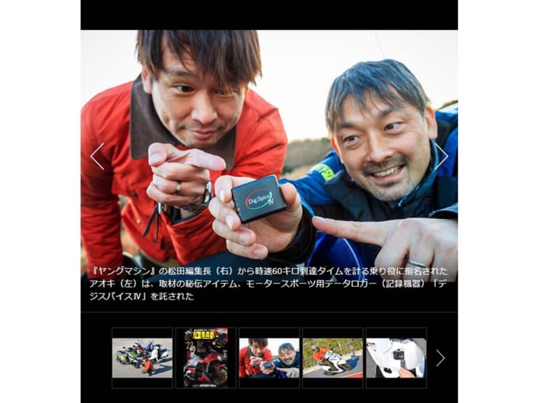 デジスパイスIVで0-60km/h加速タイムを計測するの図。ちなみに青木タカオ氏は、ヤンマシ界隈では“アオチ”と呼ばれる、元々はヤングマシン姉妹誌のビッグマシン編集部員でもあった男である。 ※写真は週プレNEWSより