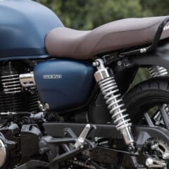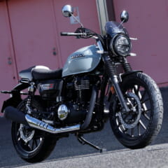 2023年型GB350に設定される新色のマットパールグレアホワイト。上品なイメージで、ブラウンのシートを採用する。黒とツヤ消し青は継続で、赤は廃止。手前に引かれたハンドルやグラブバー、メッキタイプのマフラーなどでクラシカルな雰囲気を持つ。
