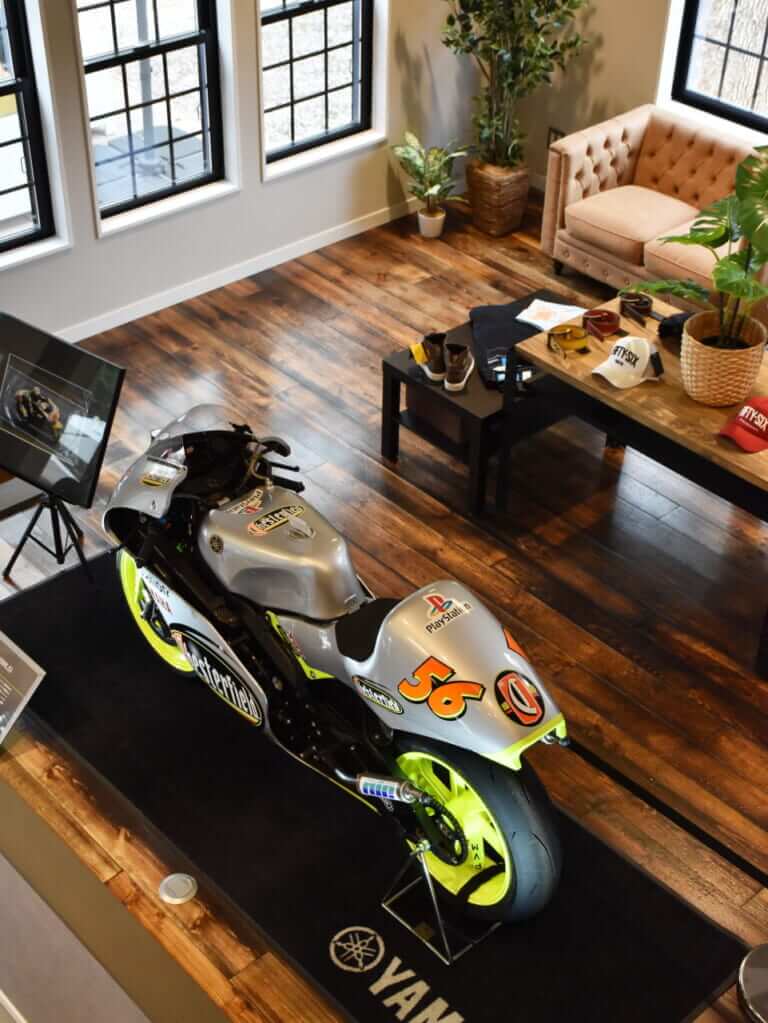 ショールームには56designの製品だけでなく、SPIDIやXPD、BREMA、さらには56designが輸入総代理店を務めるリゾマ(rizoma)の削り出しカスタムパーツも数々も展示。そしてベテランライダーには見逃せないのが、中野さんが選手としてWGP250クラスでチャンピオン争いを展開した2000年に乗っていたYZR250の実車が展示されていることだ。