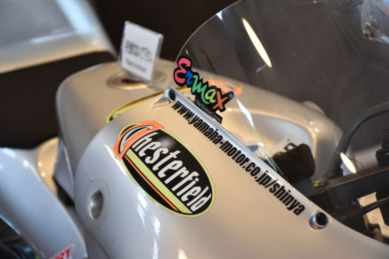 ブラック仕上げのフレームにシルバー基調のボディは懐かしく、また現在では掲出が許されていないタバコ会社のスポンサーロゴ(このマシンではチェスターフィールド)やKAYABA(現在はKYB)といったステッカーにも感慨を禁じ得ない。