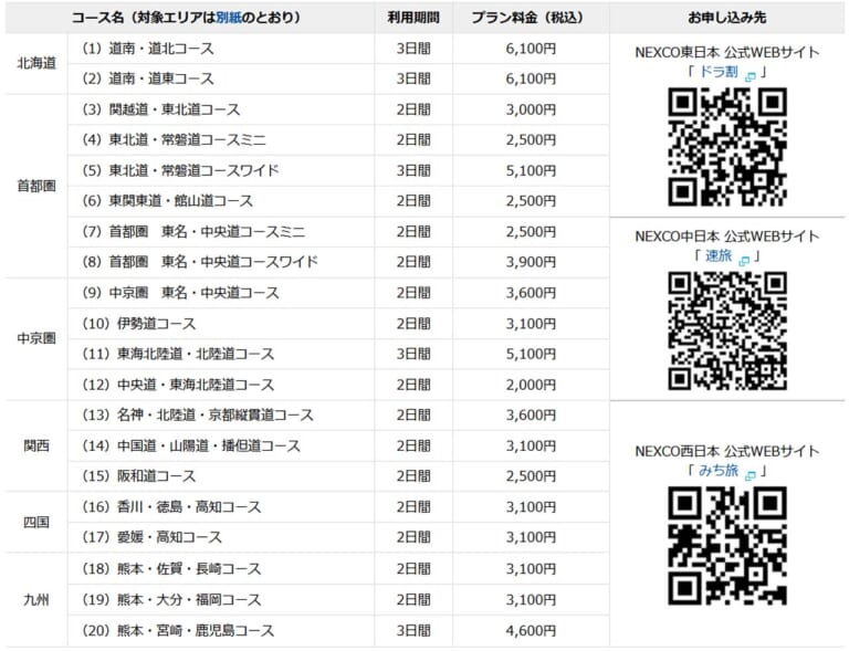 もう一方の「ツーリングプラン」ですが、こちらは対象エリアの高速道路が最大2日間または3日間の間、定額で乗り降り自由となる割引で、今年もNEXCO3社合わせて全20コースが4月1日から11月30日(北海道は10月31日まで)まで用意されています。