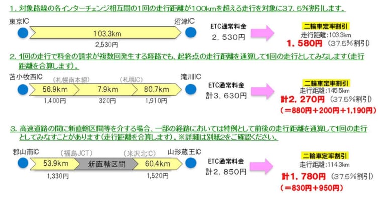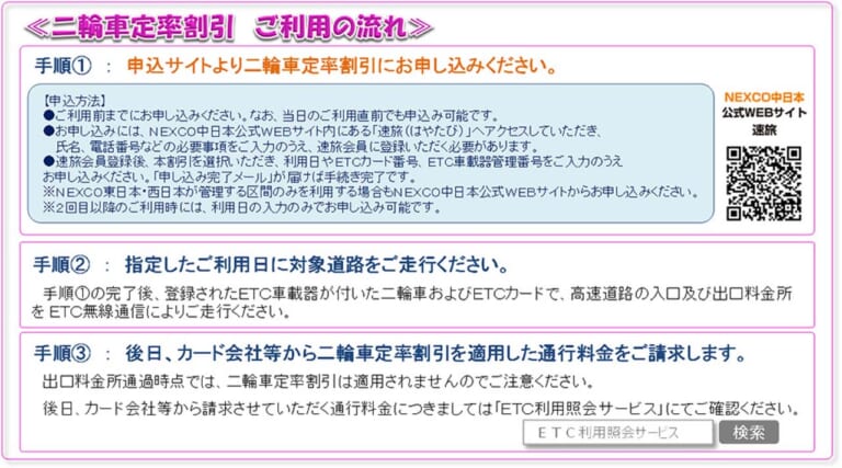 まず、NEXCO3社と宮城道路公社管轄の道路で実施されるETC限定の「二輪車定率割引」は、ETCを搭載したバイクで土日休日に対象道路を走行する場合、事前にNEXCOの中日本のウェブサイトで利用日を申し込み、利用日当日に対象道路を片道100㎞以上走行した場合に高速道路料金が普通車の半額に割引されるというものです。