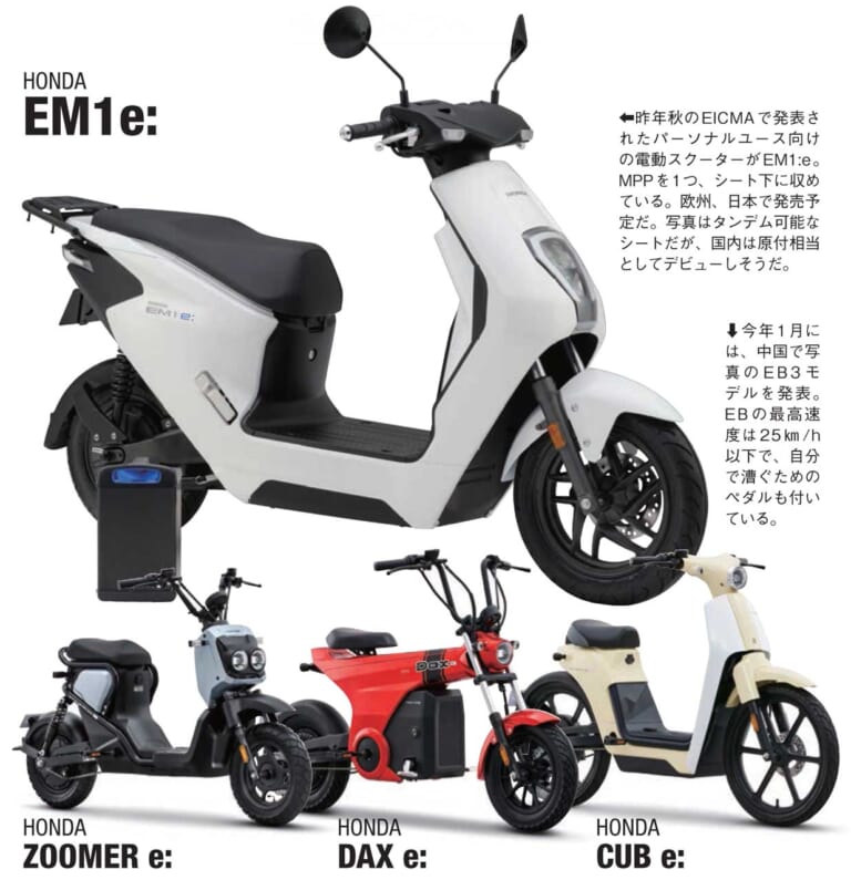 【写真上段】昨年秋のEICMAで発表されたパーソナルユース向けの電動スクーターがEM1:e 。MPPを1つ、シート下に収めている。欧州、日本で発売予定だ。写真はタンデム可能なシートだが、国内は原付相当としてデビューしそうだ。/【写真下段】今年1月には、中国で写真のEB×3モデルを発表。EBの最高速度は25km/h以下で、自分で漕ぐためのペダルも付いている。