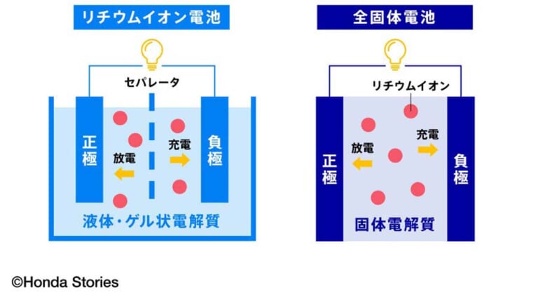 ホンダが開発に注力する全個体電池とは、従来のバッテリーの電解質を液体から個体に換えることで、充電1回あたりの走行距離が長く、充電時間も短縮できるという。また、温度変化に強く発火の危険性も低い。