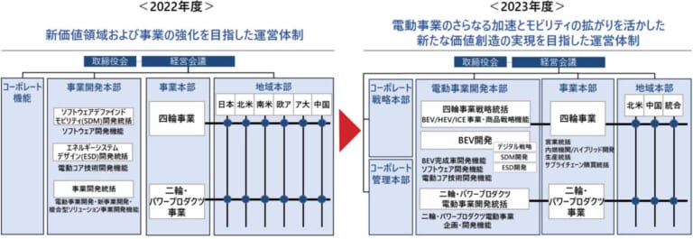 ホンダは4月1日付で、上の図のように組織運営体制を変更する。電動事業開発本部が全事業の主体となる、まさに完全電動シフトだと言えるだろう。