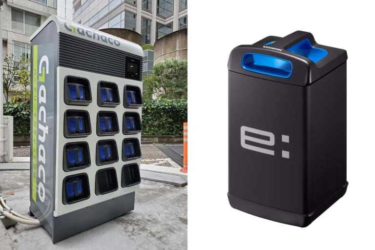 MPPは単に電動車の動力源であるだけでなく、太陽光発電などで作った電気を貯め、家庭用電源として利用することも想定されている。街中では、左のガチャコステーションで使用済みバッテリーと充電済みバッテリーを交換するシェアリングユースを想定する。