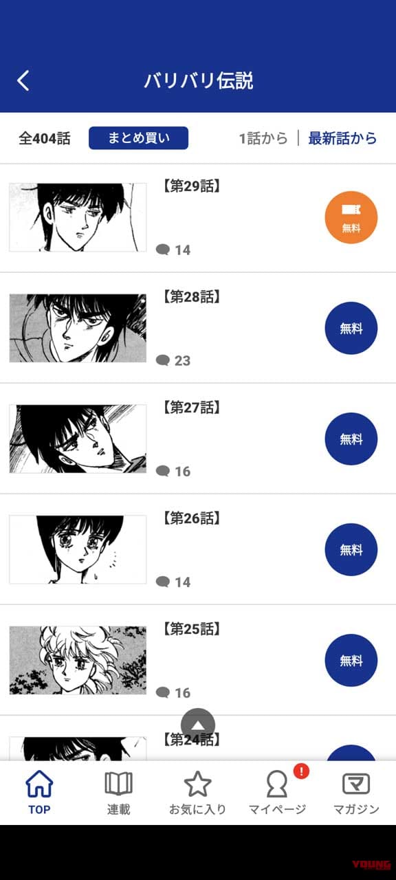 マガポケ アプリをインストールし、バリバリ伝説を検索してみた。全話リストを見るとこんな感じになる。