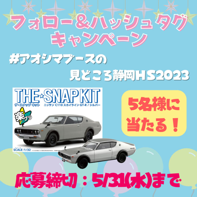 HS2023』のハッシュタグをつけてツイートした人の中から、抽選で5名様に前述の「ザ☆スナップキット ニッサン C110 スカイライン GT-R(シルバー )」 をプレゼント。また、上記内容をホビーショー当日、アオシマスタッフに見せるともれなく 「アオシマステッカー」をゲットできる。