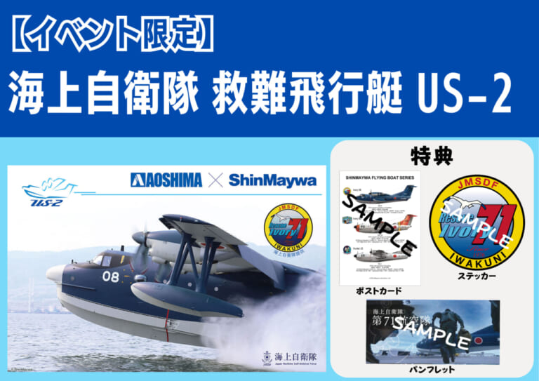 救難飛行艇『US-2』の生産でお馴染みの新明和工業株式会社がアオシマブースに登場。一般公開日にはオリジナルグッズやここでしか手に入らないかもしれないコラボ商品『新明和工業株式会社出展記念海上自衛隊救難飛行艇US-2』も販売予定とする。※数量に限りがあるため、予定数に達し次第、販売終了する場合あり