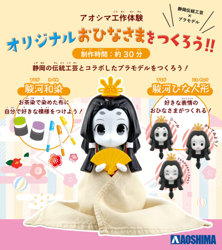 アオシマの工作体験として、静岡伝統工芸とプラモデルを組み合わせた「オリジナルおひなさまをつくろう!!」を実施。静岡の伝統工芸である「駿河ひな人形」と「駿河和染」を静岡の産業である「プラモデル」とコラボレーションさせた静岡ならではのおひなさまプラモデルの製作を体験できる。