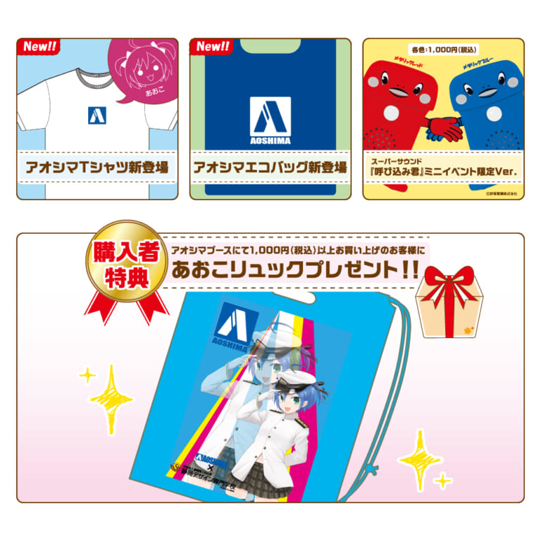 『新明和工業株式会社出展記念3大特典付き 海上自衛隊 救難飛行艇US-2』を各日限定200個、他にも『新明和工業オリジナルグッズ』『アオシマTシャツ(新登場)』『アオシマエコバック(新登場)』をはじめ、多数の商品を販売。またアオシマブースにて1000円(税込)以上購入すると『あおこリュック』をプレゼントする。※数量に限りがあるため、予定数に達し次第、販売終了する場合あり