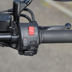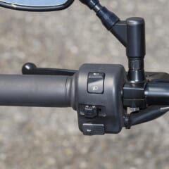【シンプルに徹したコックピット】スモークレンズのメーターは速度/積算計/距離計1/2/F/時計と非常にシンプルで、切り替えやリセット用のボタンを右側スイッチボックスに集約。