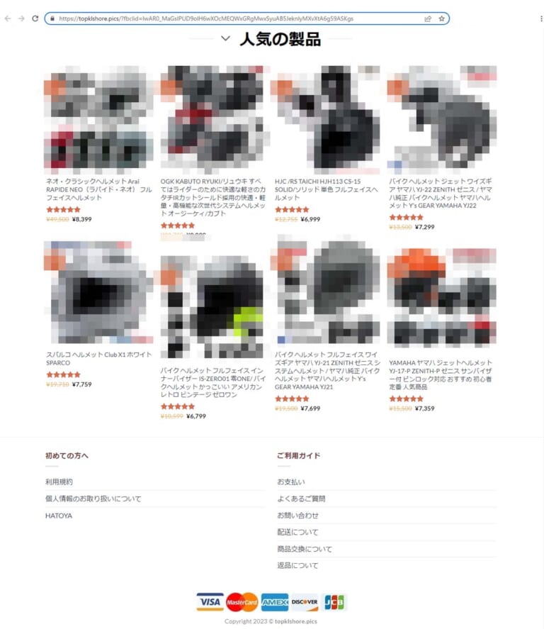 これらの詐欺広告は、実在するヘルメットメーカーの写真を無断で使用し、誘導先の偽サイトでは実在するバイクショップ等の名前を騙る。体裁だけは一丁前だったりするが、それでも冷静になって見ればおかしな部分に気付くはずだ。