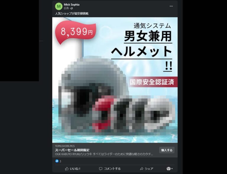 5月初旬頃からFacebookやInstagramで頻繁に表示されるようになった、高級ヘルメットの激安セールの広告を見かけたことがあるだろうか。これ、どう見てもおかしい。