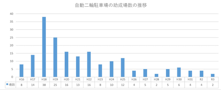 (図2)自動二輪車駐車場の助成場数の推移突出している平成18年(’06年)は改正駐車場法が施行され、違法駐車取締り関係事務の民間委託が始まった年であり、都内では多くのライダーが取締りを受けた。