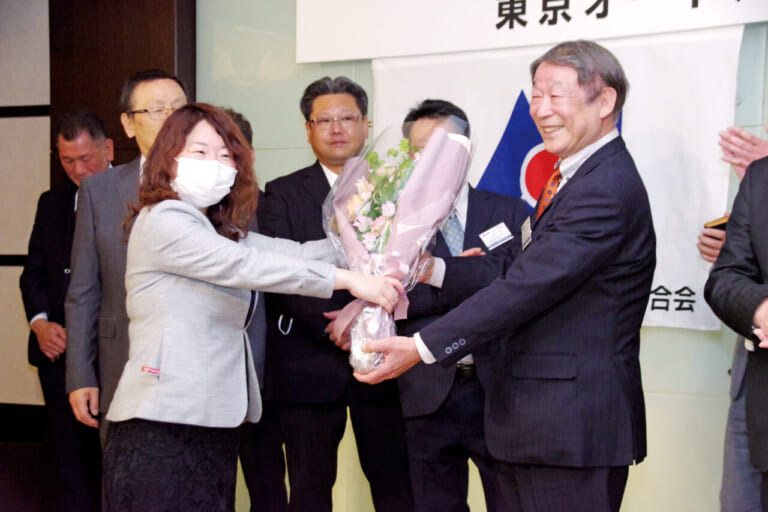 第31回AJ東京総会後の懇親会にて理事長退任の花束贈呈を受ける野間氏。