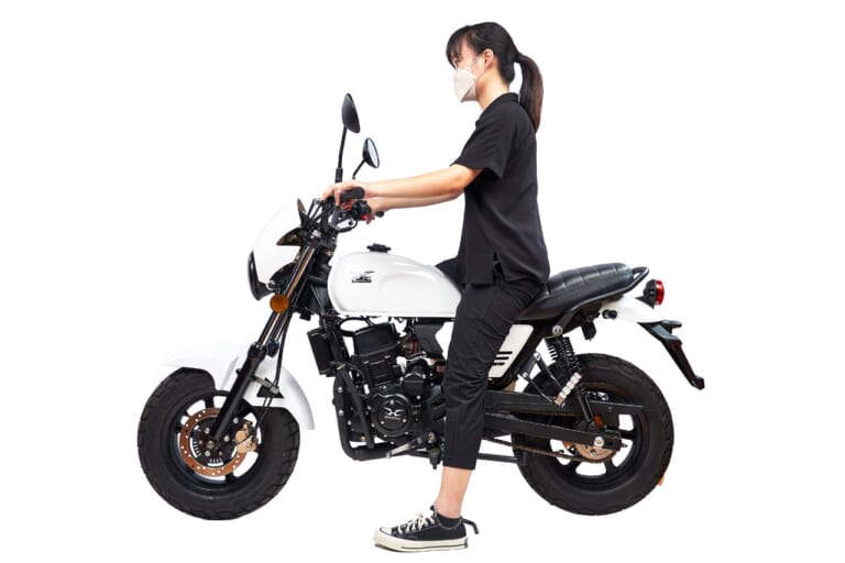 150.1ccの水冷4ストローク単気筒エンジン(4バルブ!)を搭載する「ミニ150」は、ネオクラシック風の雰囲気を持ったミニサイズのネイキッドモデル。前後12インチホイールを装着していることもあって、車格はかつてホンダが販売していたエイプ100に近い。