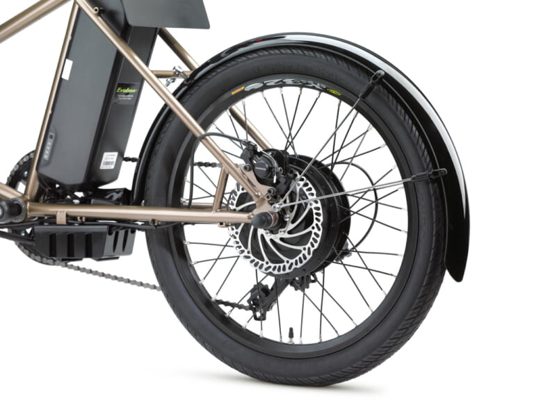 動力はインホイールモーターで発生。前後ディスクブレーキを採用する。