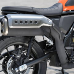 アップマフラーの張り出しがイカツイ。が、跨る際にはほとんど邪魔にならない。