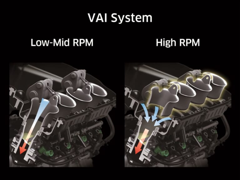 【ホモロゲ機”RR”は可変ファンネル】欧州に続き、北米モデルも登場したホモロゲーションモデルのZX-10RR。可変ファンネルVAIは高回転と低中回転で吸気管長を切り替え、全域での出力向上をねらう機構。作動にはレース用ECUが必要で、公道走行では作動しない。