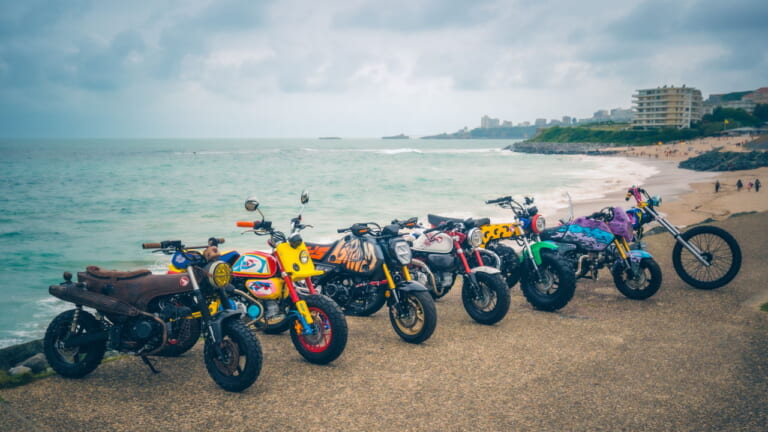 欧州7か国によるカスタムミニバイクの競演だ! これらの車両はいずれもフランスのビアリッツで6月21~25日に開催された「ホイールス&ウェーブス(Wheels & Waves festival)」に出展されたもので、2台のダックス125、2台のMSX125グロム、そして3台のモンキー125をベースに、各国のカスタムビルダーが個性豊かに創り上げたものだ。