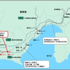 NEXCO中日本は、E1東名高速道路(東名)掛川インターチェンジ(IC)~袋井IC間の菅ヶ谷高架橋(上下線)で現在実施中の東名リニューアル工事において、2023年9月2日(土)から9月11日(月)までの間で工事する車線を切り替えると発表した。 目次 1 東名リニューアル工事概要 東名リニューアル工事概要 工事車線の切り替えは、走行可能な車線数を2車線から1車線へ変更するため、上り線(至:東京方面) […]