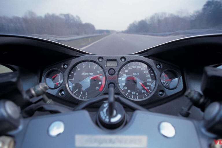 ホンダNR ['92〜]:カウルの奥に速度が浮かぶ カーボンパネル中央に白い文字盤の回転計を置く。その先にオレンジ色のデジタル速度計とオド&トリップを配置。表面から130mm奥に表示され、視線移動が少[…]