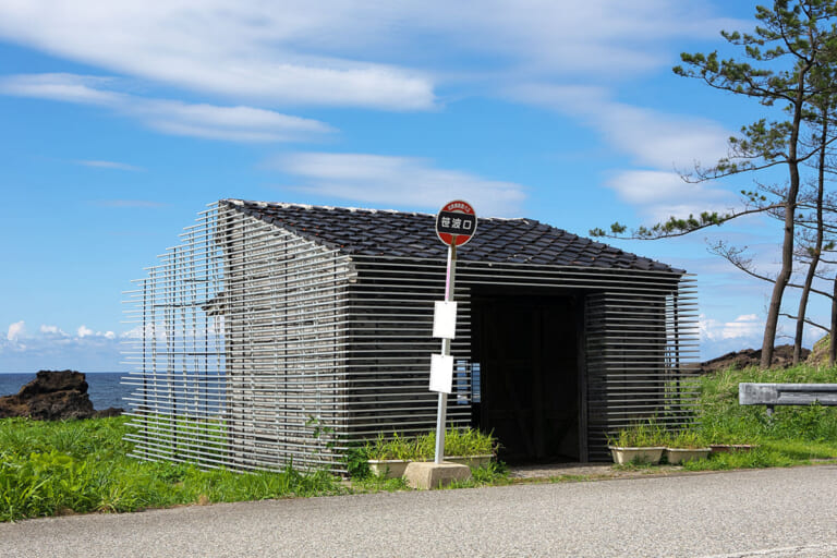 【珠洲海道五十三次 アレクサンドル・コンスタンチーノフ(ロシア)】珠洲の風景の特徴のひとつである屋根つきのバス停。数学者でもある作家は、4か所のバス停を垂直平行を基本構造とするアルミニウムのパイプで包みこみ、作品化した。立地に応じて異なるテーマでデザインされた造形は、周囲の風景と呼応してさまざまな表情を見せる。Photo:Kichiro Okamura