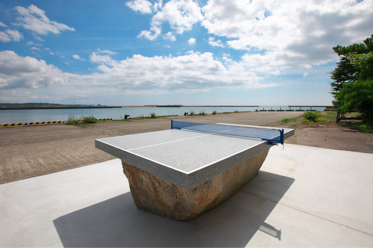 【石の卓球台第3号 浅葉克己(日本)】奥能登国際芸術祭のクリエイティブディレクターを務める作家は、卓球の名手としても名高い。卓球をコミュニケーションを活発にする絶好のツールと考える作家は、これまでにも一枚の石からつくった卓球台をデザインして各地で展開してきた。Photo:Kichiro Okamura