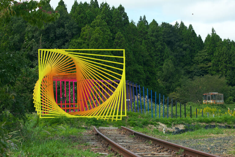 【Something Else is Possible/なにか他にできる トビアス・レーベルガー(ドイツ)】道路で断ち切られた線路跡に設置され、色を変えながらうねるような空間。鑑賞者が中を進み、行きついたところから双眼鏡を覗くと、のと鉄道の終点だった旧蛸島駅の先に、作家からのメッセージが見える。鉄道軌道跡から、かつての終着点とその風景の先にある未来を望む。エレン・エスコベード作「coatl」[1980 年メキシコ国立自治大学文化センターに恒久設置]を参照。Photo:Kichiro Okamura