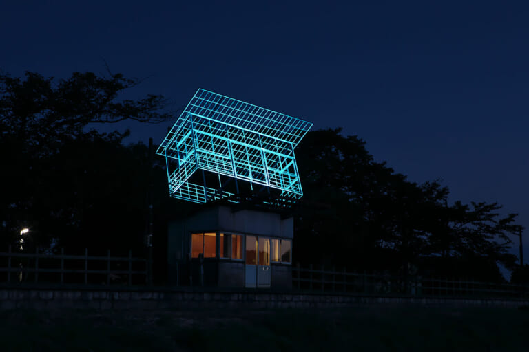 【うつしみ ラックス・メディア・コレクティブ(インド)】のと鉄道旧上戸駅の駅舎のシルエットをなぞった骨組みだけの構造物を、駅舎の上部に角度を変えて重ねた。昼間は周囲の風景になじむその構造物は、夜になると重力から解き放たれたかのように青白く光りだす。それは駅舎の亡霊なのか、それとも未来の映像なのか。場所や物がもつ記憶、非物質的なものの存在を問いかける作品。Photo:Kichiro Okamura