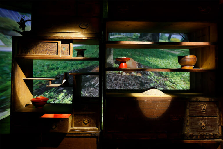 【Soilstory -つちがたり- bacilli/旧世界土協会(日本/シンガポール)】土の記憶にまつわる地元の人たちとの対話をもとに、大蔵ざらえで得た「モノ・証拠」を素材として展開する。パンデミックで生じた人の距離感を念頭に、共に有する願いを物語りとして、未来の社会のあり方を問う。Photo:Keizo Kioku