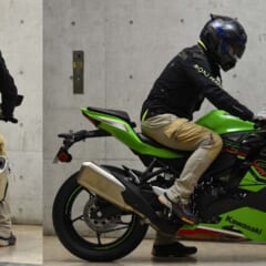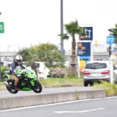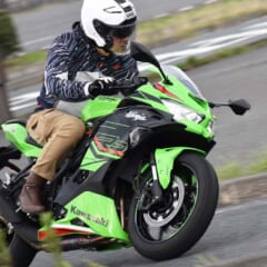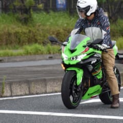 筆者の身長だとあまり参考にならないと言われがちなので、フリーライター谷田貝氏(身長172cm/体重75kg)のライディングポジション写真を載せておく。ZX-25Rよりも15mm高いシート高800mmだが両足はベッタリ着き、なんの不安もないとのこと。ちなみに身長183cmでも窮屈さはなかった。