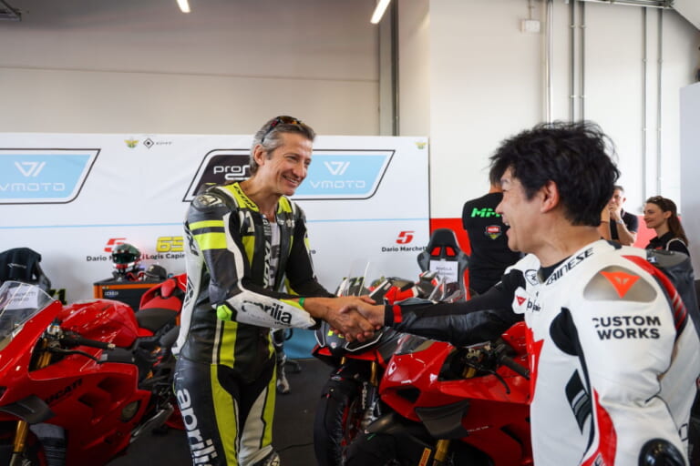 集まったプロライダーたちがとにかくスゴイ! GPチャンピオンが僕を含めて4人いましたよ。’06〜’07年の世界GP250で、’10年、’12年、’15年のMotoGPでチャンピオンになったホルヘ・ロレンソ。’81年世界GP500チャンピオンのレジェンド、マルコ・ルッキネリ。そしてこのコラムを読んでいる方ならよくご存じ(笑)、’90〜’91年に世界GP125で、’98年に世界GP250でチャンピオンを獲ったロリス・カピロッシ。そして’93年世界GP250チャンピオンの僕です。