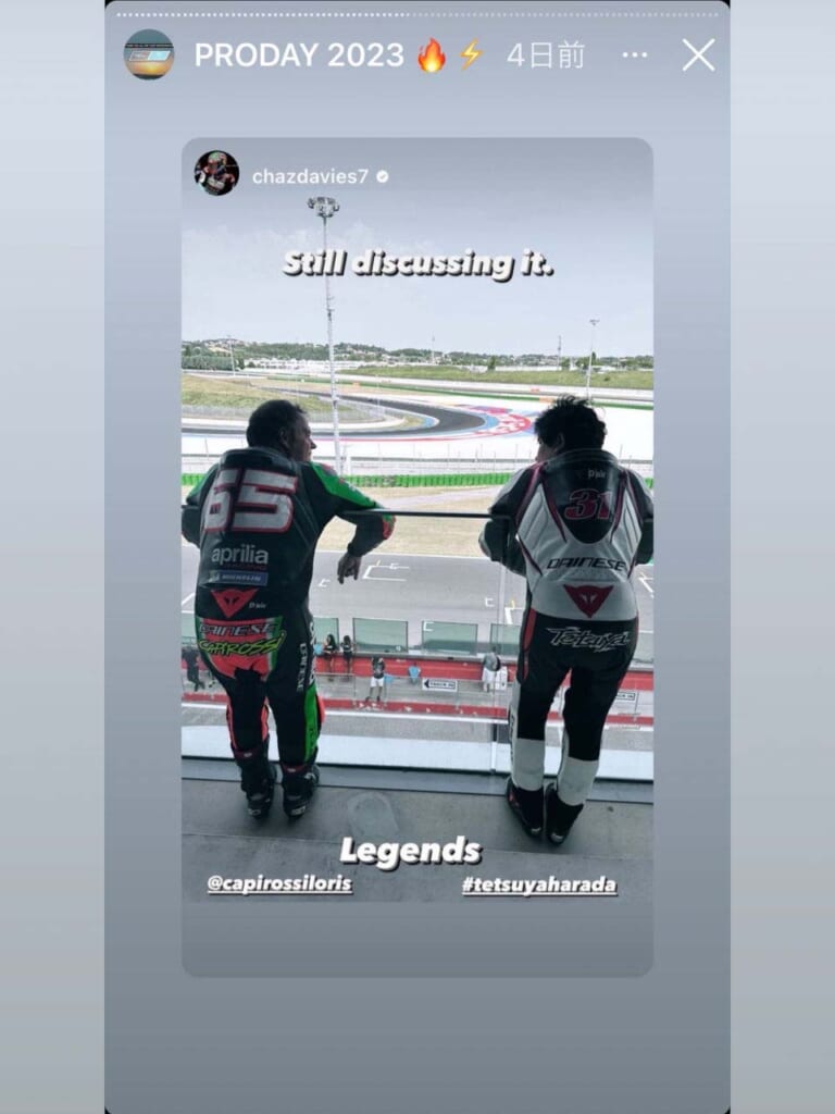 チャズは僕が現役を引退した’02年に世界GP125に参戦し始めたので、今まであまり接点がありませんでしたが、僕とロリスを尊敬してくれているようで、なぜかペコペコ(笑)。「お会いできて光栄です!」みたいな感じで、すごくいい人でした。彼はイギリス人ですが、僕とロリスの前では頑張ってイタリア語で話してくれました。