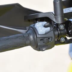 【ライディングポジション】シート高880mmで足着き性は厳しめ。30mm低いローシート(2万5520円)を純正アクセサリーで用意する。ライポジはスタンディングのしやすさも考慮。[身長175cm/体重68kg]