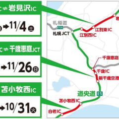NEXCO東日本北海道支社は、E5道央自動車道で高速道路リニューアル工事を令和5年8月~11月に開始すると発表した。 目次 1 位置図・交通規制予定2 工事内容 位置図・交通規制予定 番号 区間 規制種別 期間 渋滞予測 詳細 ① 江別西IC~岩見沢IC(上下線) 終日車線規制 8月21日~11月4日 なし 別紙-1【PDF:351KB】 ② 新千歳空港IC~千歳恵庭JCT(上下線) 終日車線規制 […]