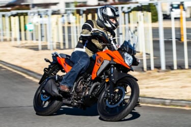 『実用的』というのは、最高出力こそ24psと控え目ながら低回転トルクが豊かで、実際に街中やツーリングで出くわすほとんどの場面で扱いやすく、エンジンを高回転まで回さなくても十分な加速を得られることに尽きる。Vストローム250はこのエンジンに加え、リラックスできるライディングポジションや優れた足着き性(シート高800mm)、大型リヤキャリアによる高い積載性などを誇り、ツーリングマシンとして求められる『長距離を走っても疲れない』性能を高めている。前後17インチホイールによる素直な操縦性も、これに貢献していると言えるだろう。