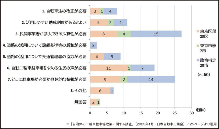 注目すべきは「自動二輪車駐車場整備を推進するための要件」についての回答だ(図1参照)。半数にあたる25の団体が「地域のどこに自動二輪車駐車場が必要か、具体的な情報が必要」と回答しているのだ。これは地域課題を改善する上で最も重要なことである市民の声が行政に届いていないということを表している。